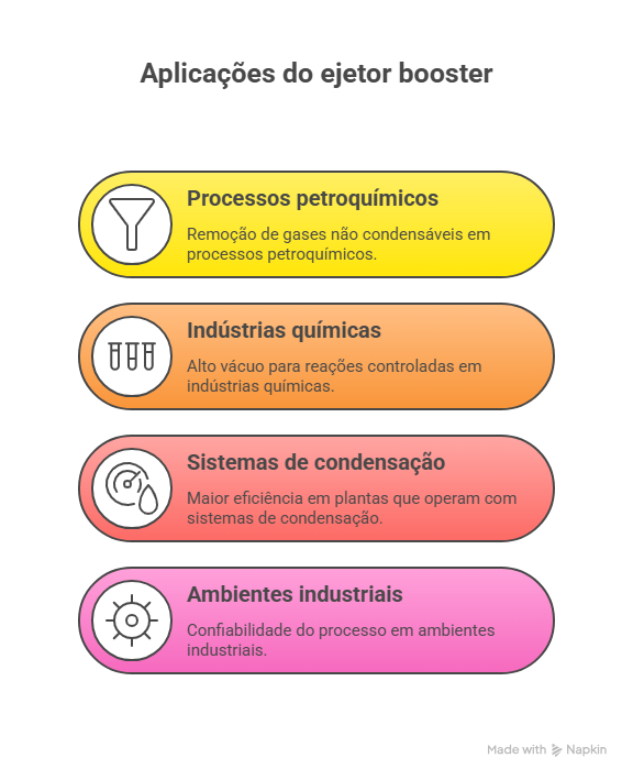 O ejetor booster industrial é amplamente aplicado em operações que exigem alto vácuo e performance contínua. Entre os principais usos, destacam-se: